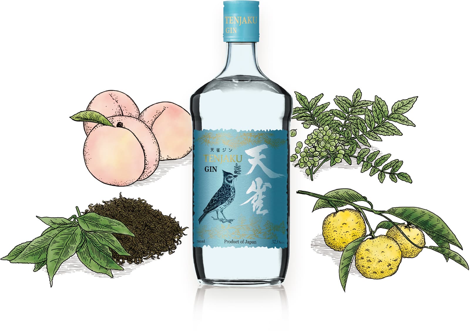 Tenjaku Gin combines a base composed of more than 10 Western botanicals with a distinctively Japanese essence: fresh, seasonal peaches from the local Yamanashi region, Japanese pepper, with a unique zesty flavor not found in European spices, yuzu, with its spreading aroma evocative of Japan, and tea, with its appealing astringent and herbal aroma... Together, these flavors create a botanical gin with a unique, authentic taste.
